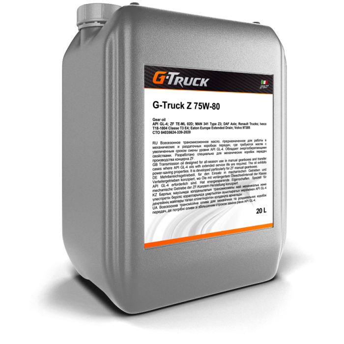 G-Truck Z 75W-80 — всесезонное синтетическое трансмиссионное масло нового поколения, созданное для механических и автоматизированных коробок передач коммерческого транспорта производства ZF. Полностью синтетическая база обеспечивает надёжность работы трансмиссии и позволяет увеличить интервалы замены масла в соответствии с регламентами автопроизводителя. Масло отличается энергосберегающими свойствами и способствует снижению расхода топлива в сравнении с традиционными продуктами классов SAE 75W-90, 75W-85, 80W-90 и 80W-85.