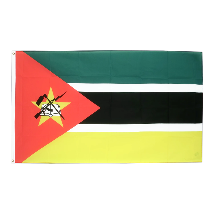 Флаг Мозамбика имеет уникальный дизайн: на фоне горизонтальных полос зелёного, чёрного и жёлтого цветов, разделённых белыми линиями, расположен красный треугольник у древка. Внутри треугольника — изображение жёлтой пятиконечной звезды, на фоне которой размещены книга, мотыга и автомат Калашникова с примкнутым штыком. Каждый элемент несёт глубокую символику, отражающую борьбу за независимость, образование и сельское хозяйство. Цвета флага символизируют богатство природных ресурсов, национальное единство и историческое наследие страны.Назначение