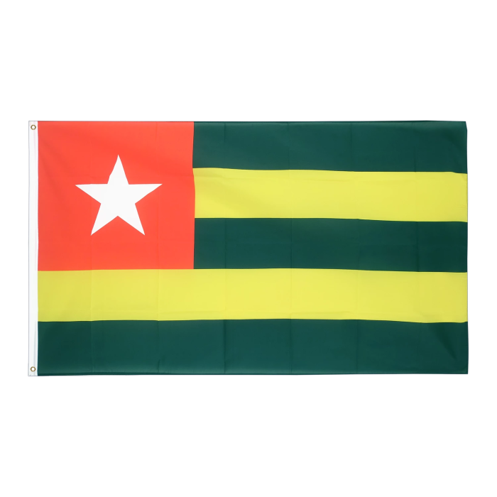 Флаг Того выполнен из полиэфирной ткани, обладающей отличными эксплуатационными характеристиками. Он устойчив к внешним факторам, легко окрашивается и сохраняет насыщенные цвета даже при длительном использовании. Легкость ткани позволяет удобно поднять флаг и предотвращает его ускоренный износ в условиях сильного ветра. Флаг Того представлен в традиционной расцветке: пять горизонтальных полос — чередующиеся зеленые и желтые цвета, а в верхнем левом углу расположена красная коробка с белой звездой. Зеленый цвет символизирует надежду и сельское хозяйство, желтый — богатство и трудолюбие, красный — жертву и стойкость народа, а белая звезда — свободу и мир. Флаг предназначен для идентификации судов при заходе в порт Ломе (Port of Lome), соответствуя международным требованиям и обеспечивая их узнаваемость в морских перевозках.-