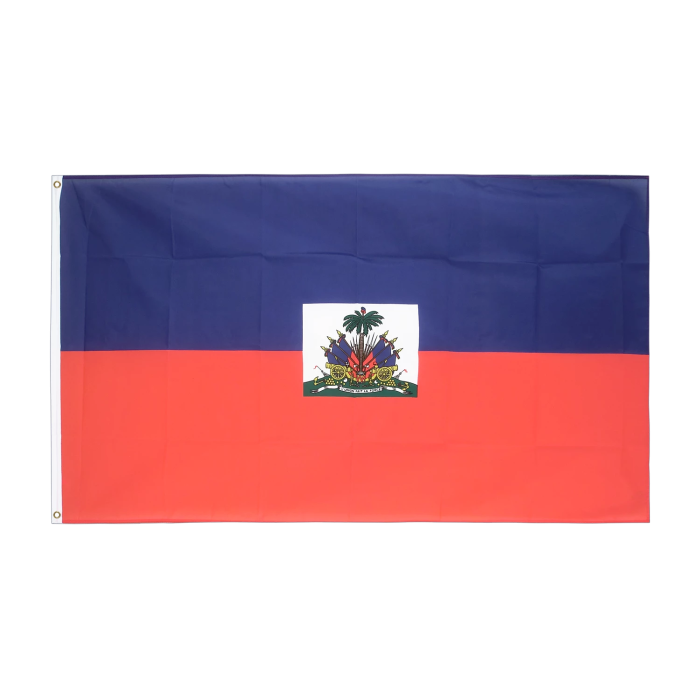 Для изготовления флага используется полиэфирная ткань плотностью около 210 г/м². Этот материал отличается высокой износостойкостью, устойчив к воздействию дождя, ветра и солнечных лучей, а также обладает способностью долго сохранять яркость окраски. Полиэфир — лёгкий материал, благодаря чему флаг удобно поднимать, и он меньше изнашивается при эксплуатации на открытом воздухе, особенно в морских условиях. Флаг Гаити выполнен в классическом дизайне: горизонтально разделён на две равные части — верхняя половина синего цвета символизирует свободу, нижняя — красного цвета — олицетворяет кровь народа, пролитую за независимость. В центре расположен герб Гаити на белом прямоугольнике, изображающий пальму, флаги, пушки и барабаны, символизируя борьбу и независимость. Все цвета нанесены точно, с яркими и стойкими пигментами, обеспечивающими продолжительный срок службы флага. Флаг предназначен для использования при судозаходах в главный морской порт страны: Порт Порт-о-Пренс (Port of Port au Prince) Он соответствует требованиям международной морской идентификации и рекомендуется для судов, заходящих в территориальные воды Гаити.