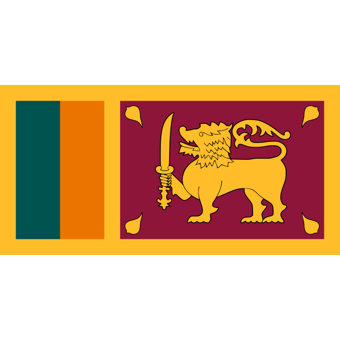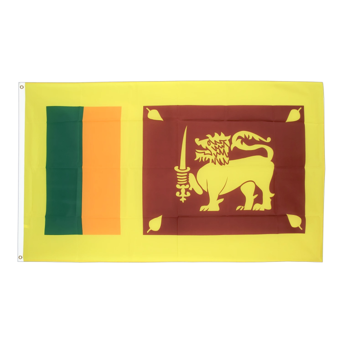 Для изготовления флага используется полиэфирная ткань с плотностью около 210 г/м². Этот материал сочетает в себе прочность, устойчивость к влаге, ультрафиолетовому излучению и ветру. Полиэфир легко окрашивается, что позволяет добиться насыщенных и стойких цветов, а его лёгкость снижает нагрузку на крепления и предотвращает быстрый износ при сильных порывах ветра. Флаг Шри-Ланки выполнен с высокой точностью воспроизведения символики и цветовой гаммы. Центральную часть занимает золотой лев с мечом на бордовом фоне — символ силы и независимости. По углам располагаются четыре золотых листа дерева бодхи, отражающие буддистские ценности страны. По левому краю флага — две вертикальные полосы: зелёная и оранжевая, символизирующие мусульманское и тамильское меньшинства. Все элементы оформлены ярко и чётко, устойчивы к выцветанию и внешним условиям. Флаг предназначен для использования при заходе судов в крупнейший морской порт страны — Порт Коломбо (Port of Colombo) Он соответствует требованиям международных стандартов и является обязательным атрибутом морского протокола при посещении территории Шри-Ланки.