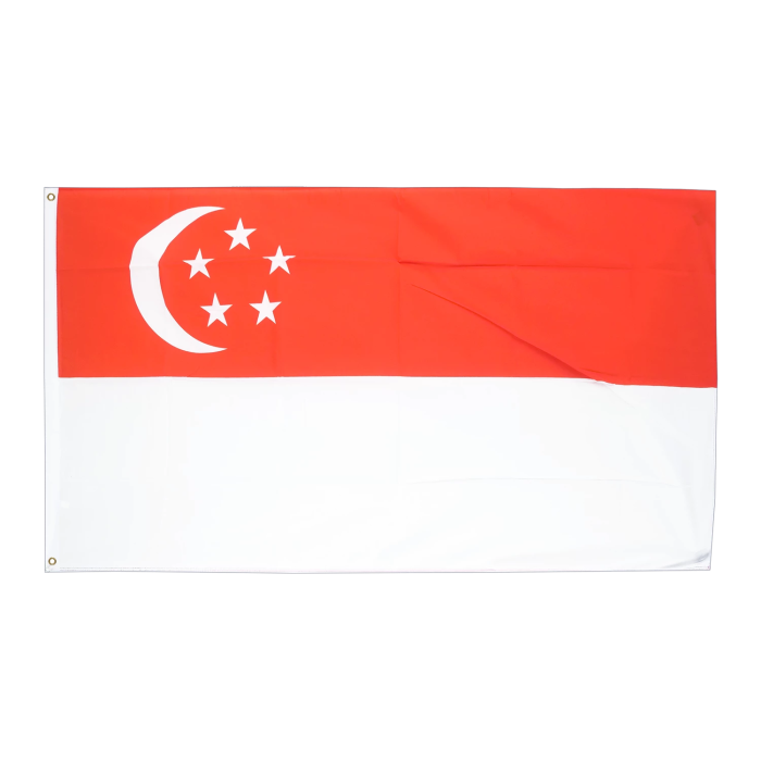 Для изготовления флага используется полиэфирная ткань с плотностью около 210 г/м². Этот материал отличается высокой прочностью и устойчивостью к неблагоприятным погодным условиям — ветру, дождю и солнечным лучам. Полиэфир хорошо впитывает краситель, благодаря чему цвета флага получаются яркими, стойкими и не выгорают со временем. Лёгкость материала облегчает поднятие флага и предотвращает его быстрое изнашивание, особенно в условиях открытого ветреного пространства. Флаг Сингапура выполнен в традиционных цветах и пропорциях. Он состоит из двух горизонтальных полос: верхняя — красная, символизирующая братство и равенство, нижняя — белая, олицетворяющая чистоту и добродетель. В левой верхней части размещены белый полумесяц и пять пятиконечных звёзд, расположенных в виде круга. Полумесяц символизирует молодое государство в процессе роста, а звёзды — идеалы демократии, мира, прогресса, справедливости и равенства. Цвета нанесены с высокой точностью и долговечностью. Флаг предназначен для использования при судозаходах в порт Сингапура (Port of Singapore). Он соответствует требованиям международной морской идентификации и используется на судах, следующих в этот ключевой азиатский хаб.