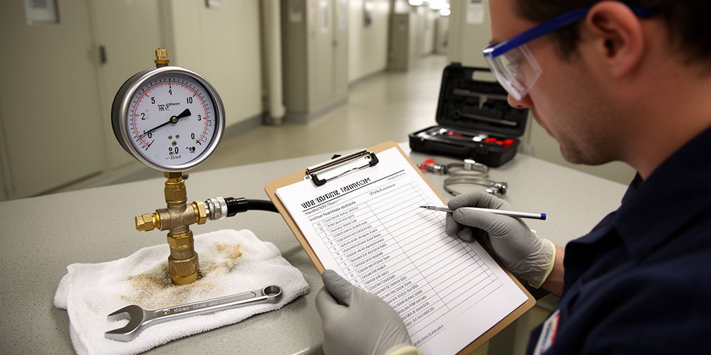 Поднять давление до рабочего +10% и выдержать 30 минут; фиксировать изменения манометра и визуально проверять отсутствие капель.